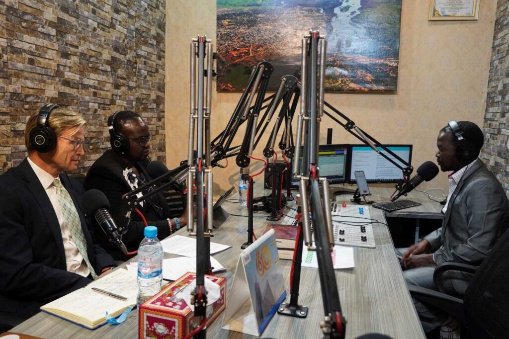 European Union deputy head of Mission in South Sudan Amb. Luther Jashke firs L, and Mrs. Gihan Michek State Mins. of Health Jonglei State Second Left , Presenter Charles K. Mark in gray Suit Right. Favour FM Juba.